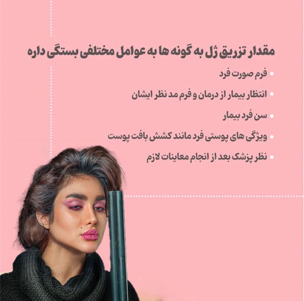 1– مقدار ژل تزریقی؛ که بر اساس فرم صورت، چهره و حالت فرد و انتظار او از نتیجه، مقدار متفاوتی برای هر فرد استفاده می شود و بدیهی است که هر چه میزان ژل تزریقی بیشتر باشد، هزینه نهایی نیز بیشتر می شود.